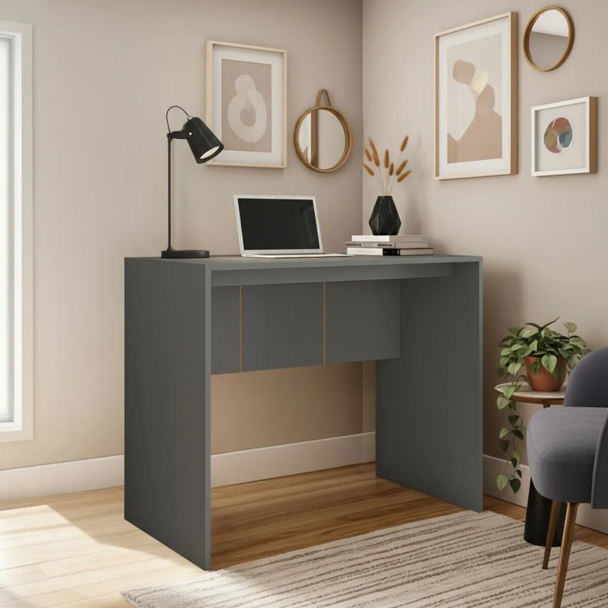 Renová tu oficina o rincón de estudio con el Escritorio Cubic, una pieza práctica, elegante y resistente que combina diseño contemporáneo con excelente durabilidad. Su tono gris plomo y los frisos decorativos frontales le aportan personalidad y estilo, ideal para ambientes modernos y minimalistas.