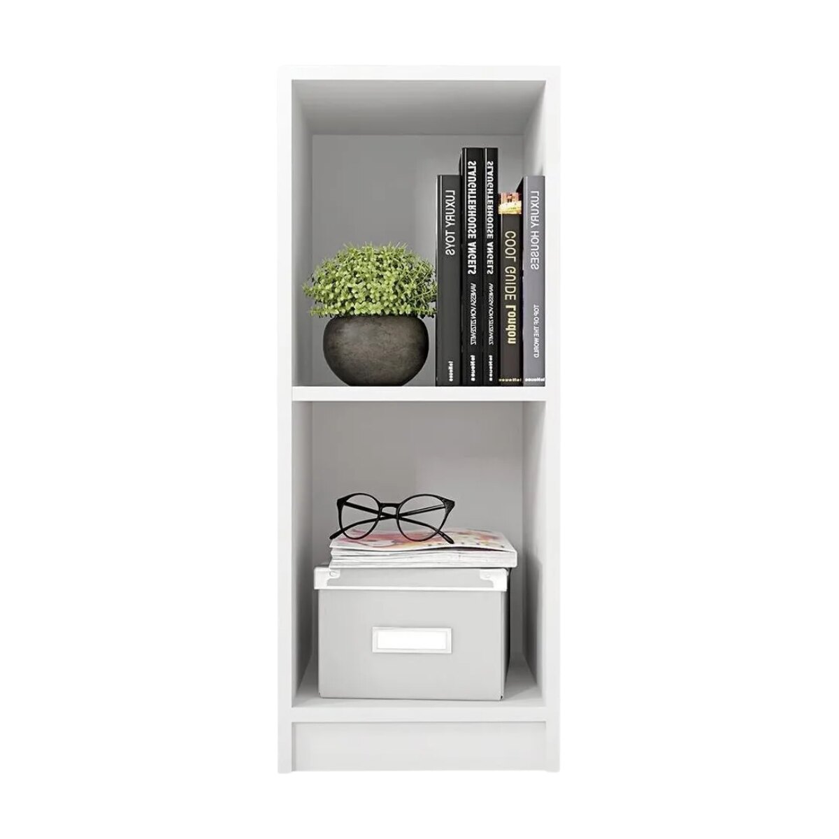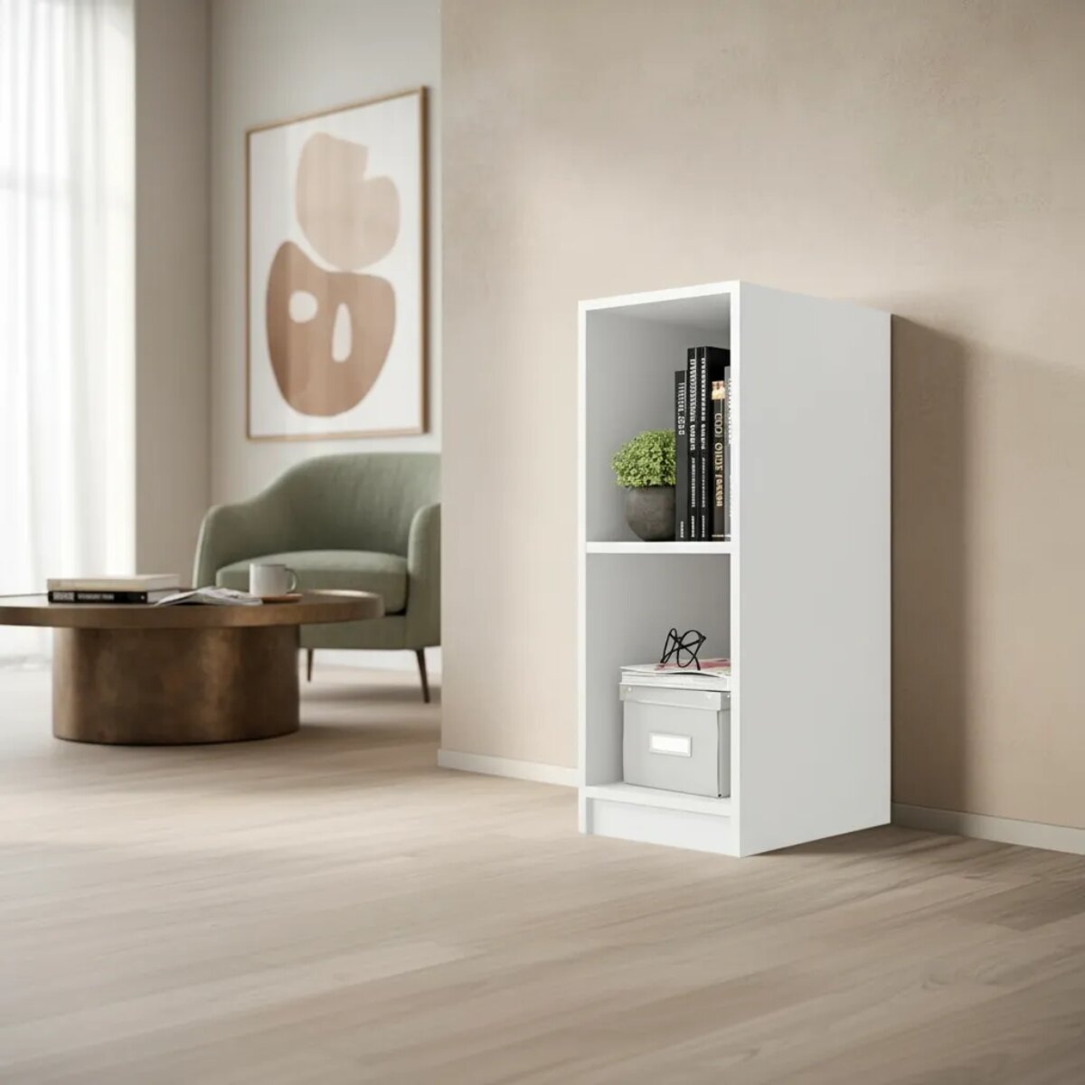 Cuenta con dos nichos amplios que permiten guardar libros, cajas organizadoras, carpetas o elementos decorativos, manteniendo todo ordenado y siempre a mano. Su terminación en color blanco con acabado mate aporta un estilo limpio, moderno y fácil de combinar con cualquier tipo de decoración.