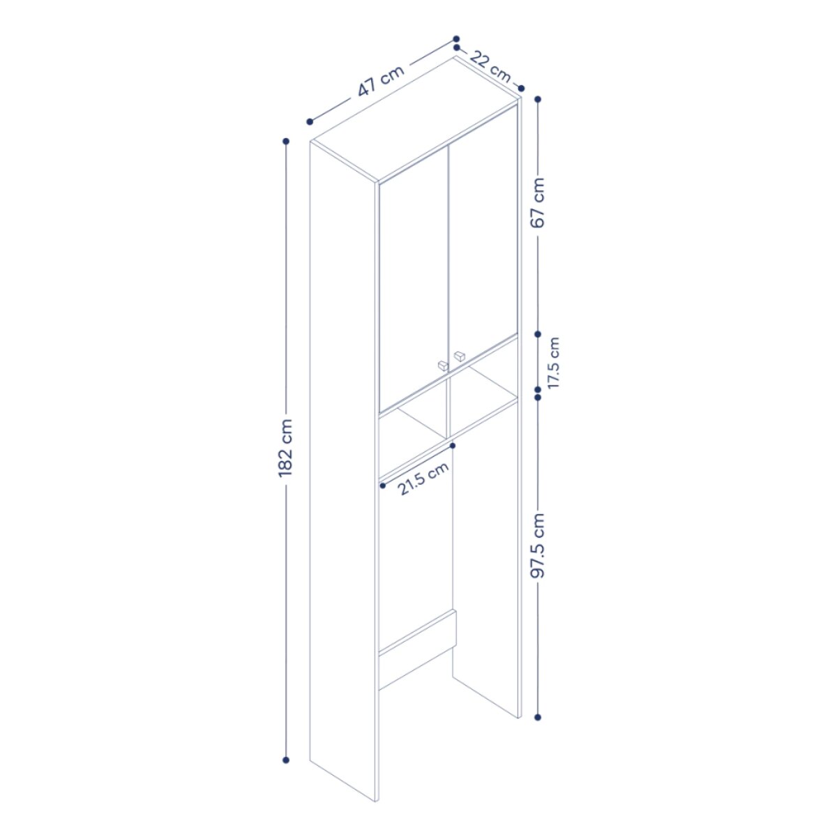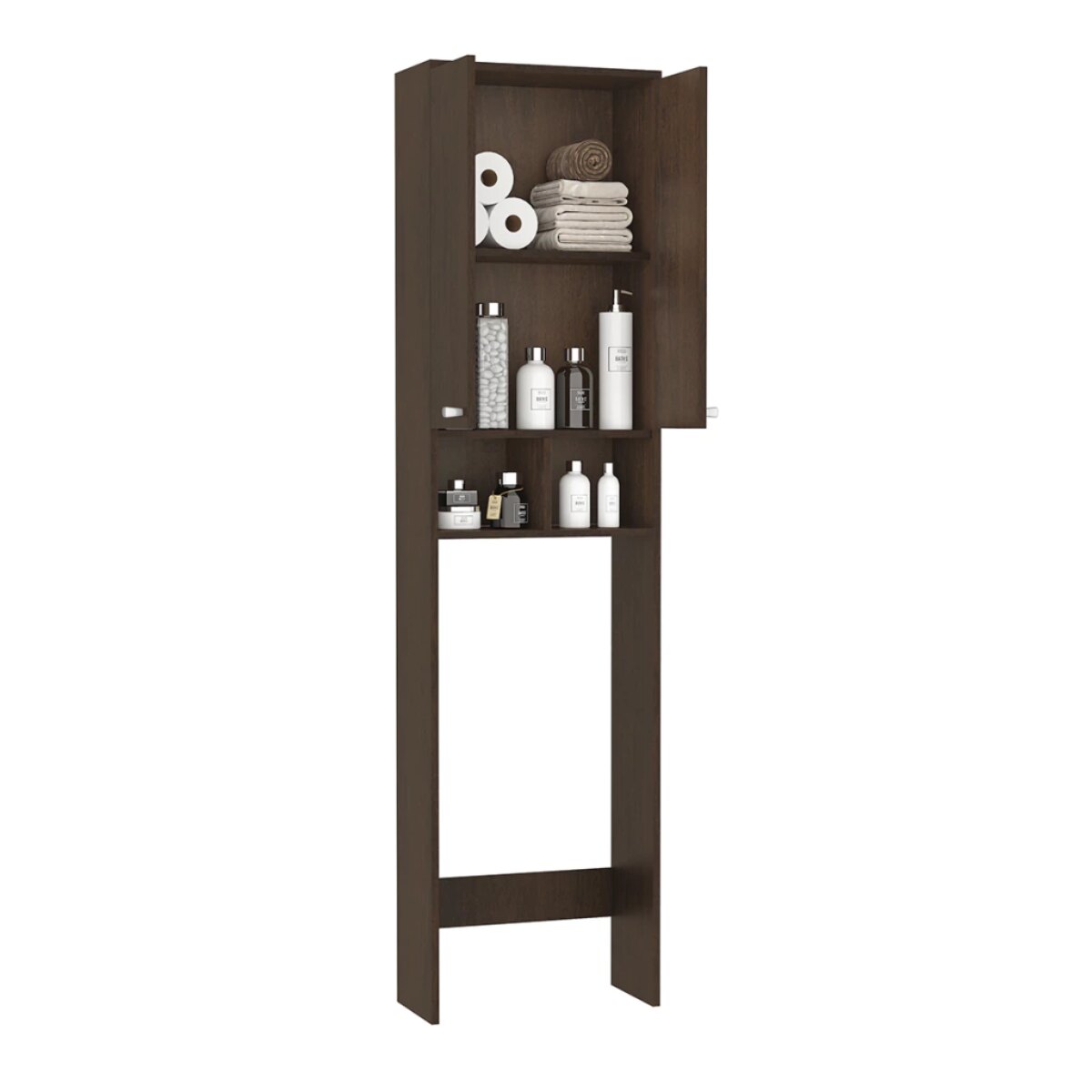 Cuenta con 2 puertas en la parte superior y 4 entrepaños en total, ideales para organizar toallas, papel higiénico, productos de higiene y accesorios de uso diario. Su formato alto y angosto es perfecto para baños chicos o espacios reducidos.