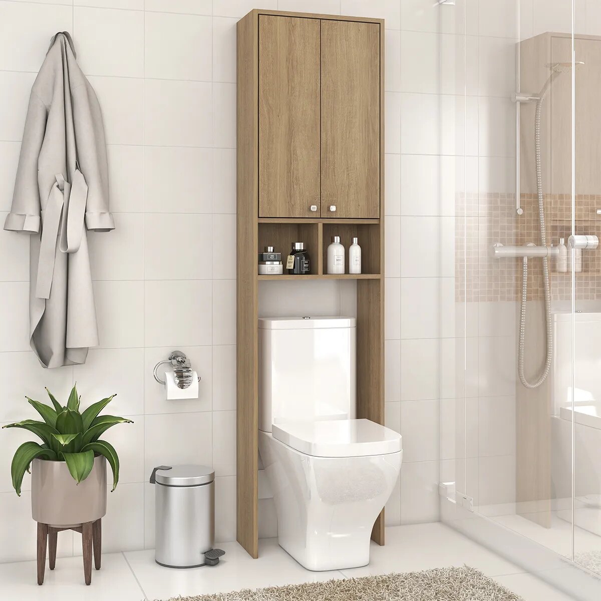Aprovechá al máximo el espacio de tu baño con el Mueble Organizador de Baño Fellicci Móveis GB15. Diseñado para colocarse sobre el inodoro, este mueble vertical te permite sumar almacenamiento sin ocupar espacio extra, manteniendo el ambiente ordenado, práctico y con un diseño moderno en color miel.