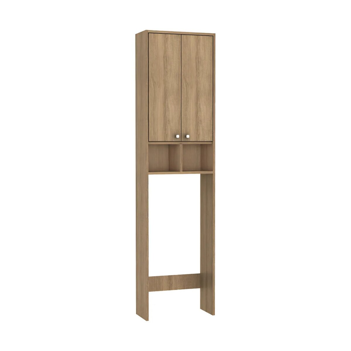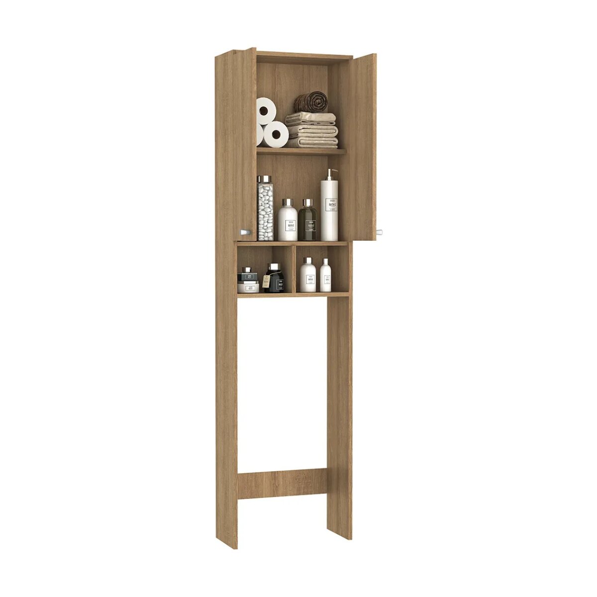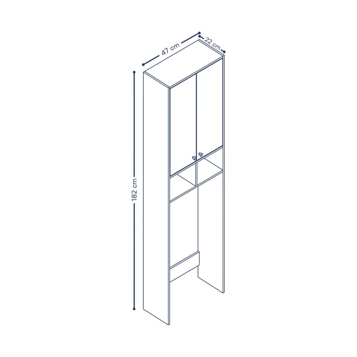 Cuenta con 2 puertas en la parte superior y 4 entrepaños en total, ideales para organizar toallas, papel higiénico, productos de higiene y accesorios de uso diario. Su formato alto y angosto es perfecto para baños chicos o espacios reducidos.