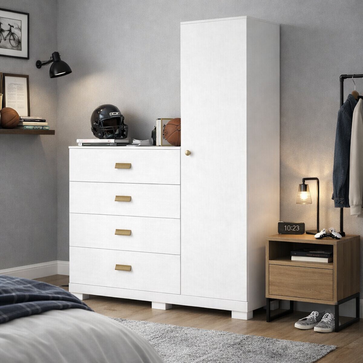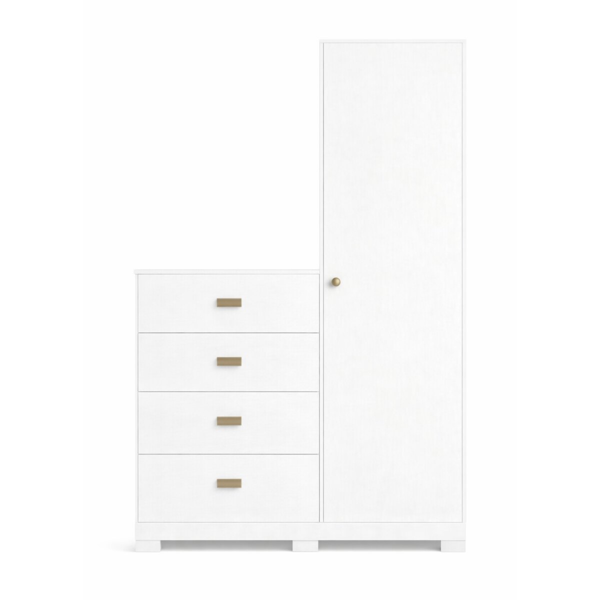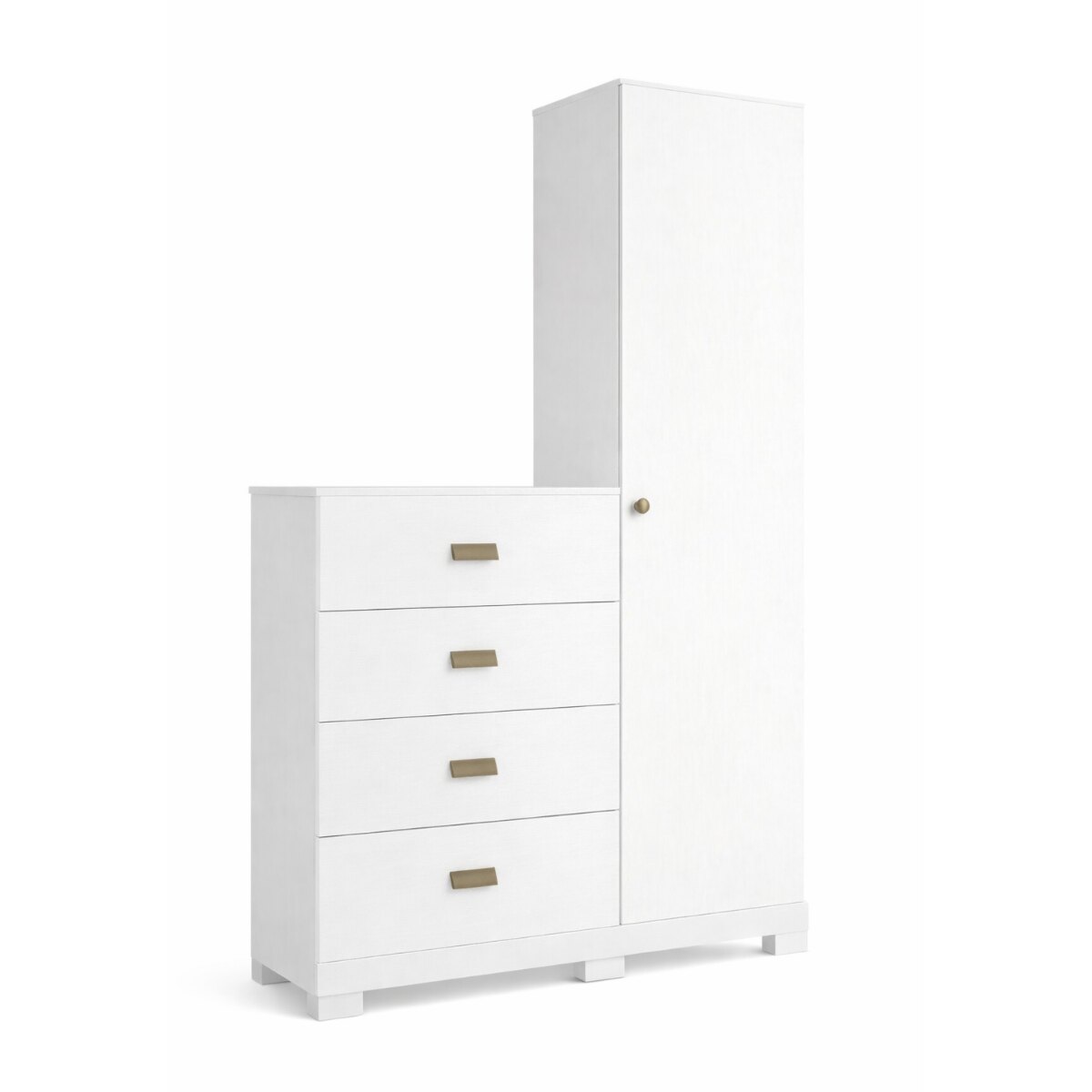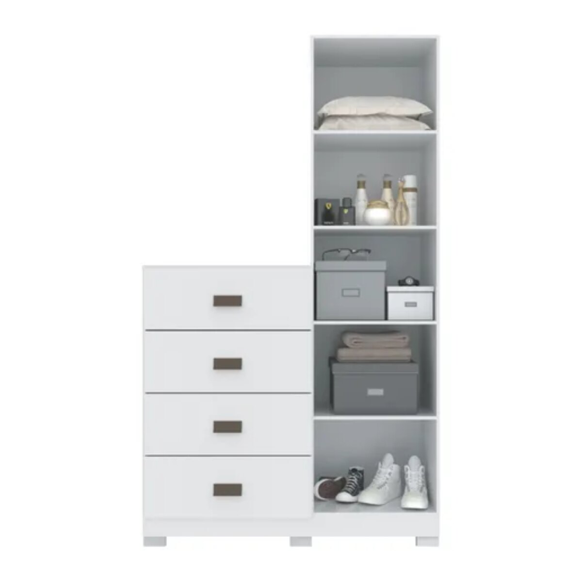 Este mueble está pensado para ofrecer una solución completa de organización en un solo lugar. Cuenta con 4 cajones grandes con guías metálicas, que aseguran una apertura suave, firme y duradera, ideales para guardar ropa, textiles u objetos de uso diario. Además, incorpora 1 puerta con 4 estantes internos, perfectos para organizar calzado, accesorios, ropa doblada o ropa blanca.