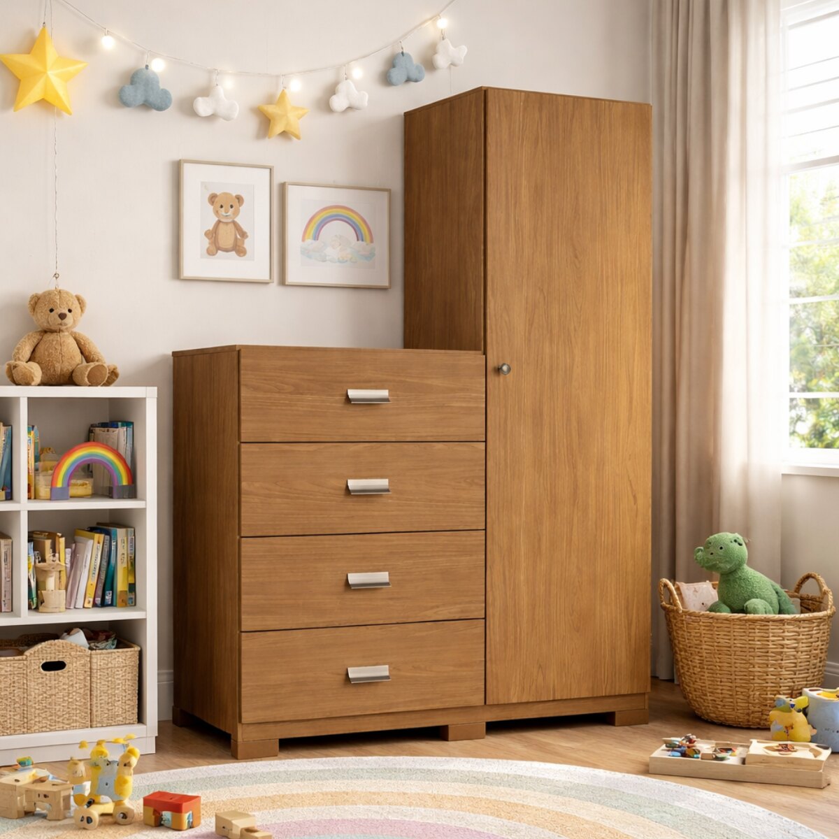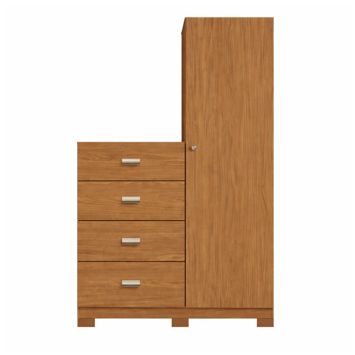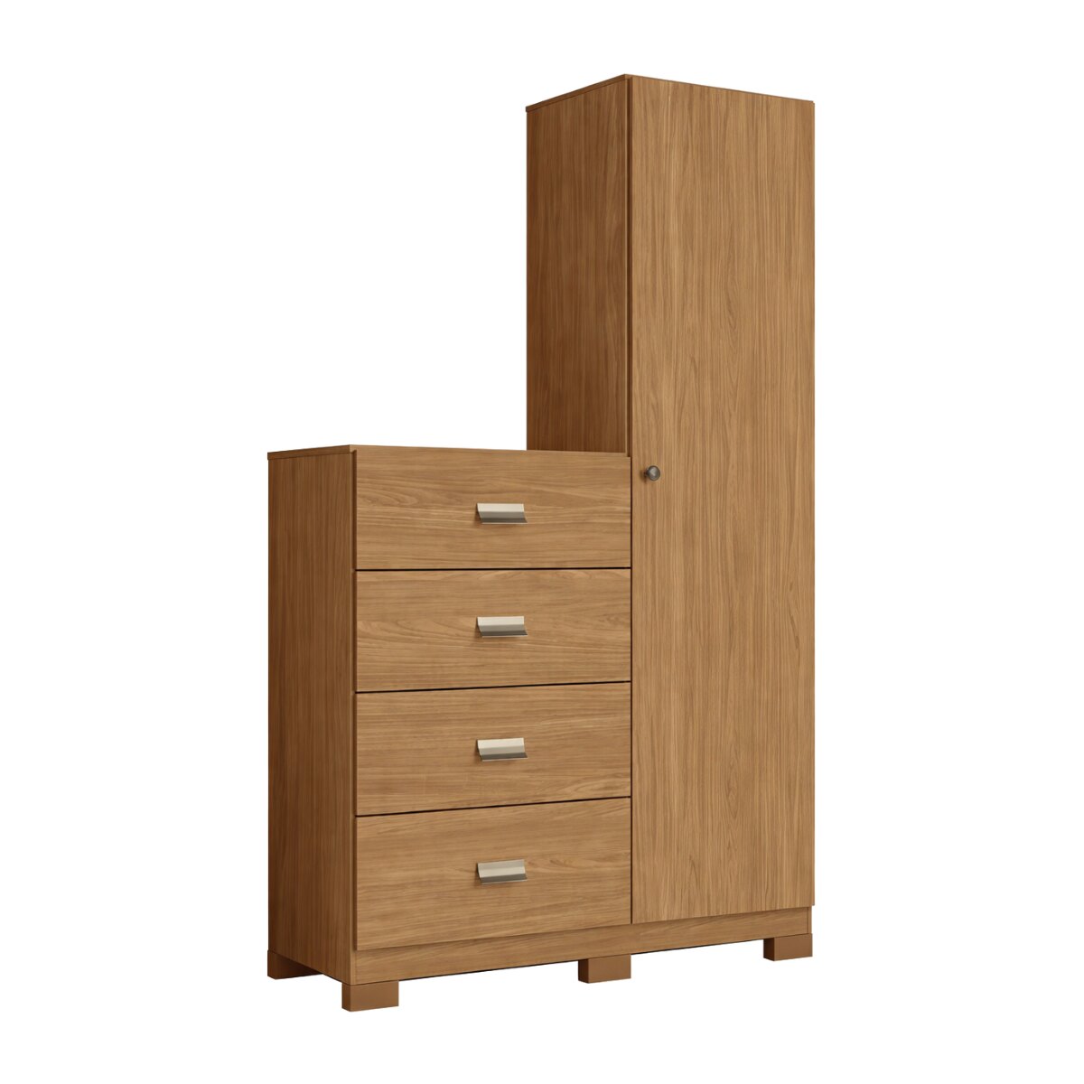 Cuenta con 4 cajones amplios con guías metálicas, ideales para organizar ropa, ropa de cama, toallas y accesorios, con un deslizamiento suave y resistente. Además, incorpora una torre lateral de 1,80 m de altura con 1 puerta y estantes internos, perfecta para guardar calzado, cajas, objetos decorativos y todo lo que necesites tener ordenado.