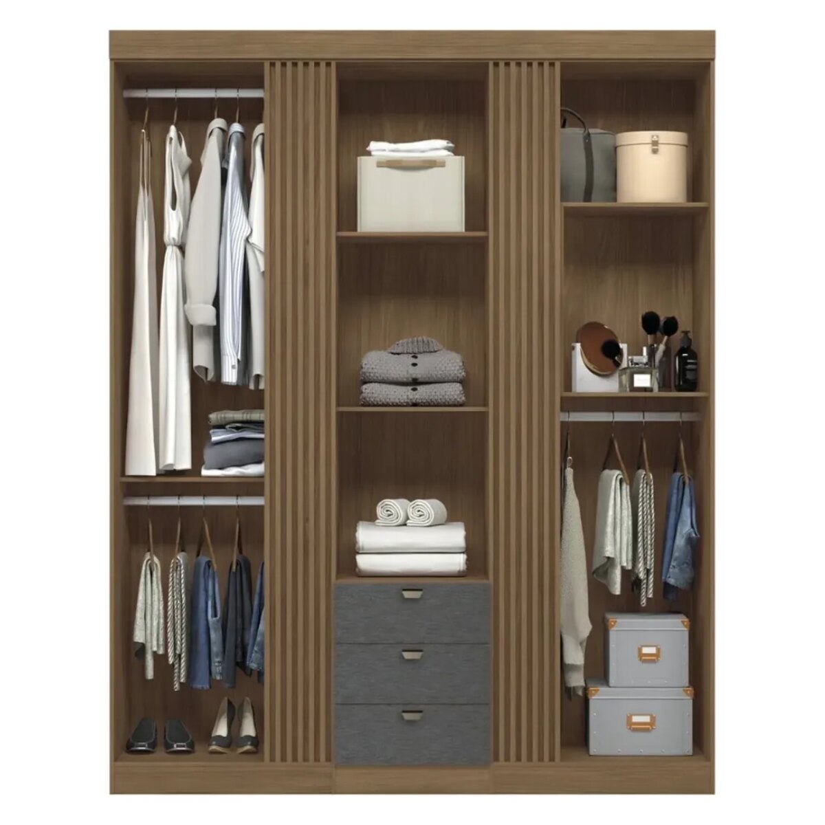 Gracias a sus 3 puertas y 3 cajones con correderas telescópicas, vas a poder guardar toda tu ropa de manera ordenada y con fácil acceso. Además, cuenta con amplios espacios internos, estantes resistentes y barrales de aluminio que permiten una excelente distribución.