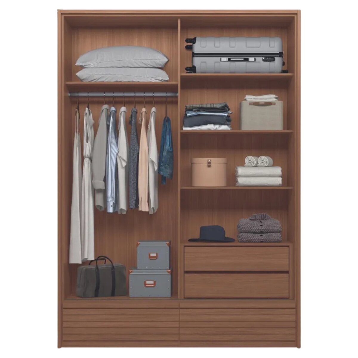 En su interior, el placard ofrece excelente organización, con estantes amplios, maleteros superiores y un barral de aluminio reforzado para colgar prendas largas o cortas. Además, incorpora 4 cajones externos con correderas telescópicas, que garantizan apertura total y deslizamiento suave.
